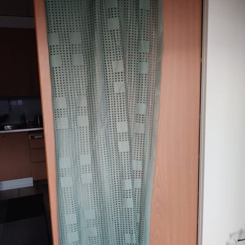 Jotex verho graafisella kuosilla. Verhossa on suuri, tyylitelty ihmishahmo vihreässä asussa ja yksityiskohtia koruista. Sopii käytettäväksi esimerkiksi olohuoneessa tai makuuhuoneessa ikkunaverhona tai tilanjakajana. Materiaali vaikuttaa sileältä ja kevyeltä kankaalta, joka päästää jonkin verran valoa läpi.
