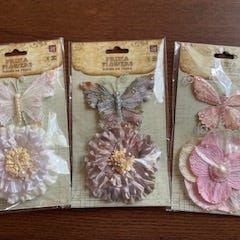Prima Flowers perhoskoristeet askarteluun, pakkauksessa 4 kappaletta. Koristeet ovat vaalean ja pronssinsävyisen ruskean värisiä, kohokuvioituja perhosia, joissa on metallinhohtoinen pinta ja koristeelliset tuntosarvet. Sopivat esimerkiksi korttiaskarteluun, skräppäykseen ja muihin paperi- ja sisustusaskarteluprojekteihin.