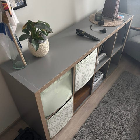 Hyllypinnoissa on käytönjälkiä ja auringon haalistamia kohtia. Yhdessä hyllyssä on pieni kupru, jonka saa onneksi toisen hyllyn jalan alle piiloon.