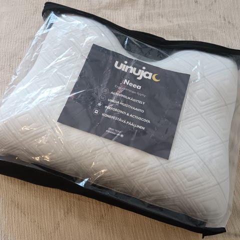 Uuden veroinen Derilan Ergo tyyny, vaalean sininen. Ostin täältä kuvauksella ”käyttämätön”. Itsellä oli kokeilussa 2 yötä tyynyliinan kanssa. Ei sopinut omaan käyttöön niskaongelmien takia.