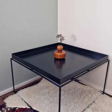 Tarjotinpöytä koostuu yksinkertaisesta teräskehikosta, jonka päällä on irrotettava tarjotin.