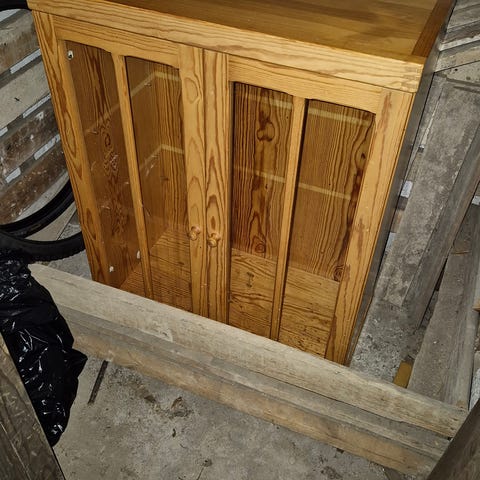 Ikean mustanruskea vitriini. Pieni kolhu alaosassa, ja muutama pieni käytönjälki. Yleisilme kuitenkin siisti.