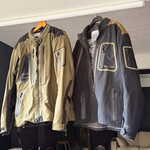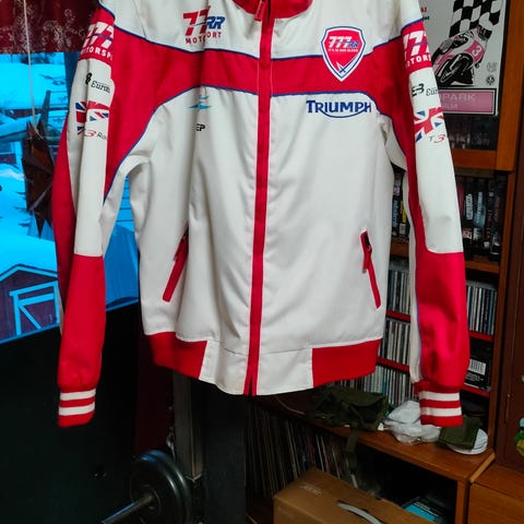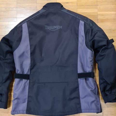 Triumph Motorcycles ajotakki. Koko XL. Väriltään musta, jossa rintaa ja selkää kiertävä ruutukuvio sekä punaiset raidat. Selässä suuri Triumph-logo ja rinnassa merkki. Vetoketjukiinnitys edessä. Sopii moottoripyöräkäyttöön tai vapaa-ajan takiksi.