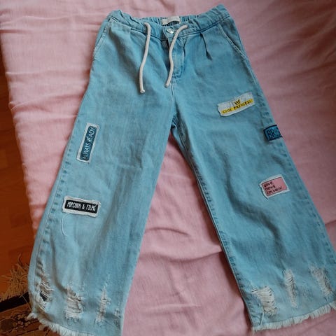 Leopardi housut, leveälahkeiset, paksu kangas. Hyvässä kunnossa, vaikka polvet valeampia.