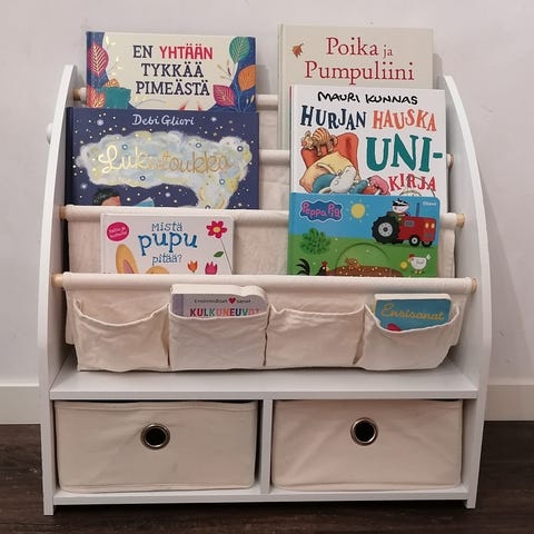 IKEA lasten hylly talon muotoinen. Hylly on valmistettu vaaleasta puusta, taustalevy on valkoinen ja katolla on vihreä savupiippuyksityiskohta. Edessä on useita lokeroita, jotka sopivat esimerkiksi kirjojen, lelujen tai pienten esineiden säilytykseen lastenhuoneessa. Hylly voidaan asettaa lattialle seinää vasten. Soveltuu lasten käyttöön ja sisustuselementiksi lastenhuoneeseen.