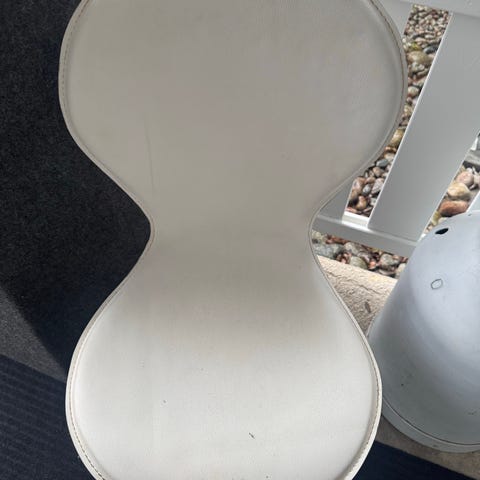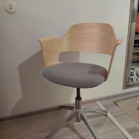 Hattefjäll tuoli vaaleanpunaisella kankaalla ja valkoisella metallirungolla