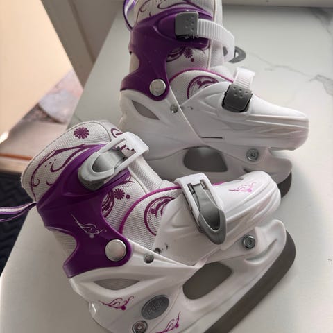Lasten säädettävät luistimet. Säädettävä välillä 26–29. Väri valkoinen ja violetti. Helppo ja nopea solkikiinnitys. Hyvä käytetty kunto. Kaikki säädöt ja soljet toimii kuten pitää.