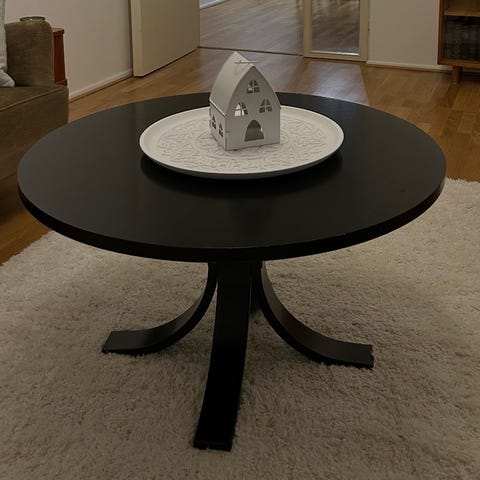 Ellos home malliston metallinen pyöreä sohvapöytä. Väriltään tumma oliivin vihreä. Pöytäkannessa pieni lommo, joka näkyy kuvassa.