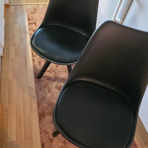 Tuoleissa tekonahkapinta. Pientä kulumaa saattaa olla puuosissa sekä yhdessä tuolissa istuinosassa sivussa pieni reikä, mutta yleisilmeeltään siistit, ehjät tuolit.
