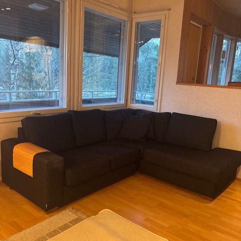 Myydään kulmasohva, jonka saa helposti vuodesohvaksi.