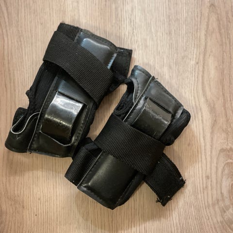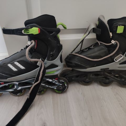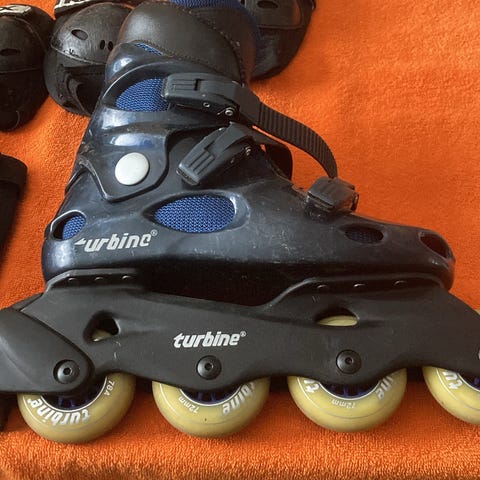 Rullaluistimet ja suojavarusteet. Kuvassa näkyy musta–punaiset rullaluistimet sekä polvi-, kyynär- ja rannesuojia violeteilla yksityiskohdilla. Sopii rullaluisteluun ja muuhun vastaavaan käyttöön, jossa tarvitaan perus suojausta raajoille ja ranteille. Tarkemmat koko- ja merkkitiedot eivät käy ilmi kuvasta.