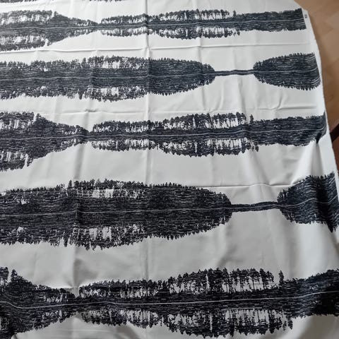 Vallila Interior verhokangas UUSI. 152x306cm kokoinen pala. Kukka on kooltaan 39x33cm. Puhtaan valkoisella pohjalla musta ruusu.