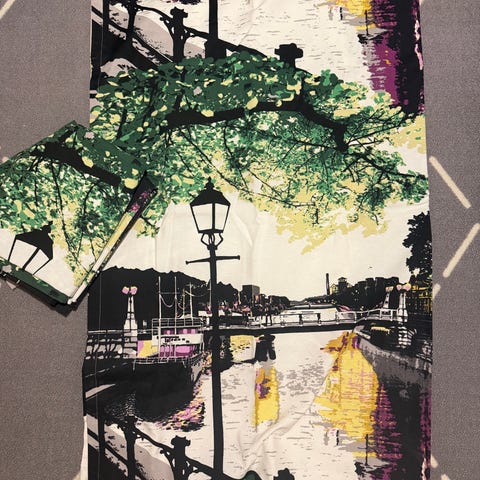 Vallilan yksittäinen violettisävyinen isokuvioinen verho.