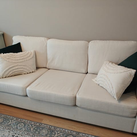 Siitä hyvä kolmen istuttava sohva seuraavalle. Ovh 400 luokkaa. Perus käytön jälkee ja tahroja löytyy mutta täysin toimiva jousien ja tyynyjen puolesta. Ei repeymiä eikä reikiä missään.