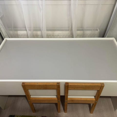 Lapsen valkoinen koulupöytä. Ehjä, mutta kulumaa pinnassa ja pöytälevyn etureunassa kuvan 2 mukaisesti. Vain Nouto.