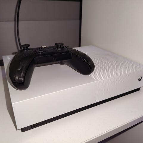 Microsoft Xbox One S pelikonsoli valkoisena versiona. Muutama peli mukaan ja pari ohjainta josta toinen langallinen. Langallinen ohjain hiukan liikkuu itsestään.