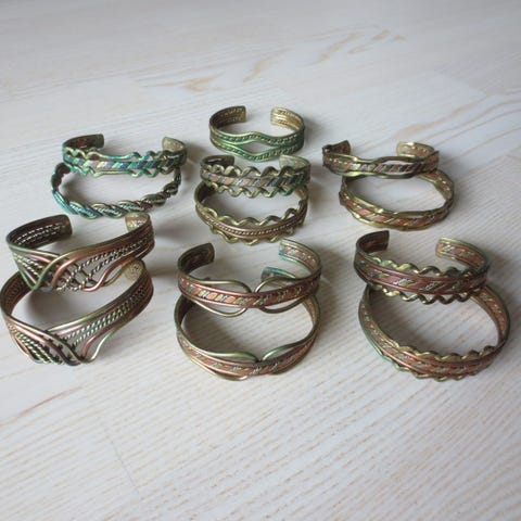 Nepalissa käsin valmistettuja kuparisia ja messinkisiä mantra-rannekoruja. Korut taipuvat joten ne sopivat ohuemmalle ja hieman paksummallekin ranteelle. Leveiden korujen leveys n. 2cm ja kapeiden n.1cm. Ota huomioon että tuotekuva voi poiketa hieman vastaanotetusta, koska en ole kuvannut jokaista kappaletta erikseen.
