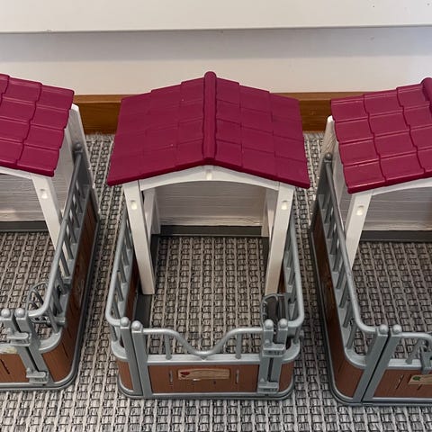 Schleich navetta jossa on kaksi karsinaa, yläparvi, tikkaat, portit, vesiletku, lehmien rapsutusharja, paikkoja tarvikkeille jne. Soveltuu eläinaiheisiin leikkeihin Schleich navetan eläimille tai hevosille.