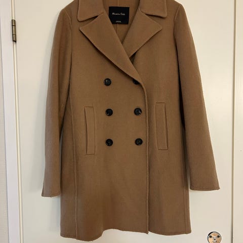 Massimo dutin musta pitkä pohjepituinen klassinen suora villakangastakki. 70% villa, 10% kashmir. Koko 36 eli S. Sopii hyvin kevääseen. Takana halkio keskellä.