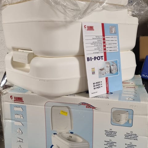 Pakettina siisti ja vähällä käytöllä ollut Thetford Porta Potti, Aqua Kem annospussit ja kolme rullaa Aqua Soft wc-paperia. Lisäksi Porta Potin päälle menevä kangassuoja.