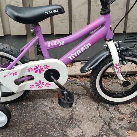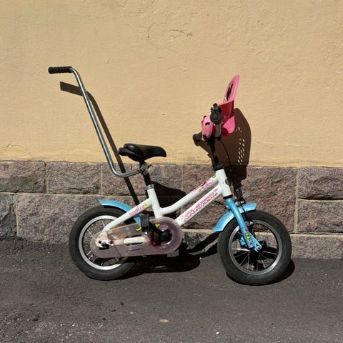Lasten polkupyörä 12" valkoinen–violetti, apupyörillä ja työntöaisalla