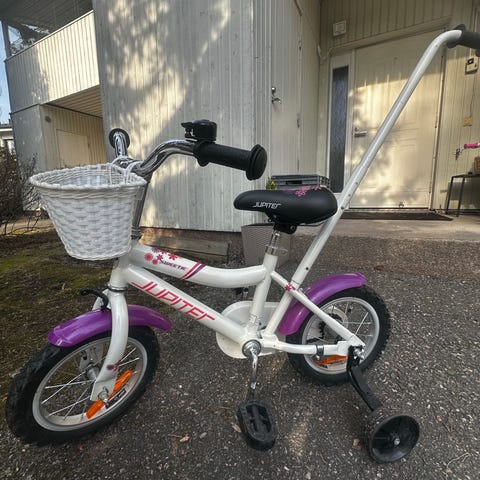 Jupiter 12 lasten polkupyörä, jossa 12" renkaat. Pyörässä on punainen runko, musta etuhaarukka sekä musta satula ja ohjaustanko. Varusteluun kuuluvat apupyörät, lokasuojat, ketjusuoja, heijastimet ja soittokello. Soveltuu pienille lapsille ensimmäiseksi polkupyöräksi, ja yli 100cm saakka.