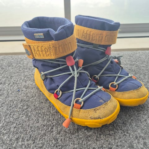 Affenzahn lasten siniset kangaskengät, koko 28. Käytetyt, ehjät ja ok kuntoiset lukuun ottamatta kuvassa näkyvää pientä reiän alkua.