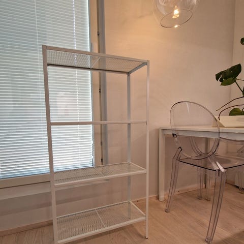 Myydään IKEA BAGGEBO kaunis valkoinen metallinen hylly. Sopii erinomaisesti esimerkiksi märkätilaan tai wc:hen.