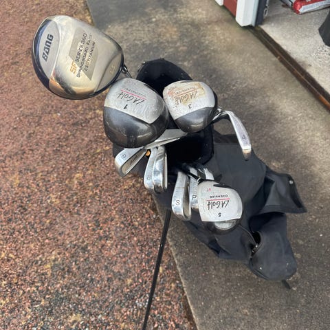 Hyvä setti aloittelijalle. Kaikki mailat kunnossa kuten myös bägi. Putteri puuttuu mutta sen saat ostettua halvalla tuohon lisäksi.