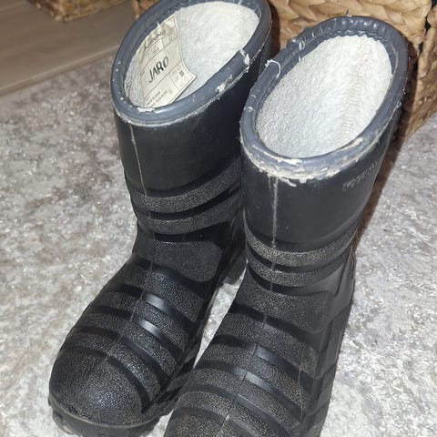 Myydään vaalean oranssit/lohen väriset vuorilliset kumpparit kokoa 32. Ehjät, likapinttymää kuvien mukaisesti.