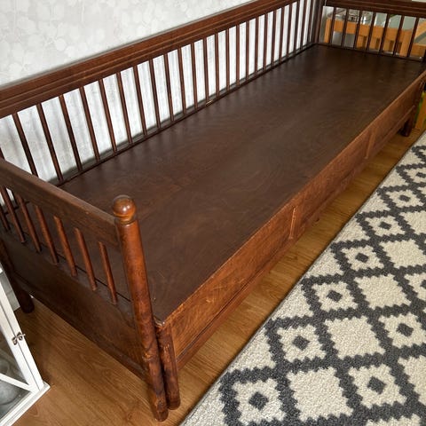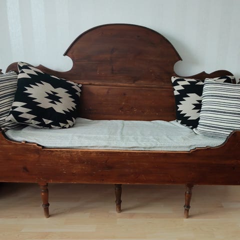 Siistissä kunnossa oleva levitettävä puusohva.