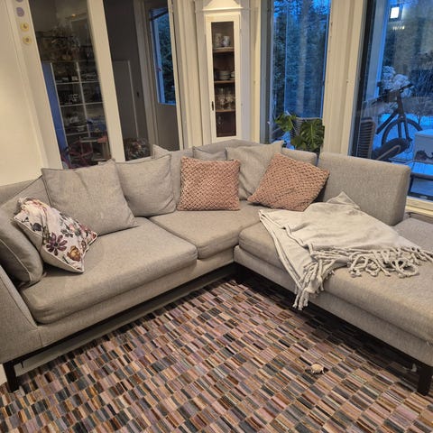 Sohva on kohtalaisessa / hyvässä käytetyssä kunnossa. Kankaassa ja tyynyissä on jonkin verran normaalia käytön jälkeä ja painaumaa/kulumaa(kuvissa näkyy) , mutta kokonaisuutena sohva on edelleen siisti ja täysin käyttökelpoinen. Sohva on myös ollut koirataloudessa .