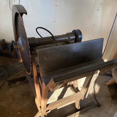 Sähkökäyttöinen puunhalkaisukone tukevalle metalliselle telineelle asennettuna. Koneessa on sähkömoottori ja vaakasuuntainen halkaisupöytä, jossa puu liukuu terää vasten. Runko ja jalusta ovat metallia, ja laitteessa on siirtämistä helpottavat pyörät toisessa päässä. Soveltuu polttopuiden halkaisuun kotipihalla tai mökillä. Tarkemmat tekniset tiedot, kuten teho ja halkaisuvoima, eivät käy ilmi kuvista.