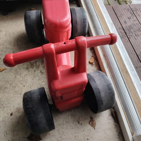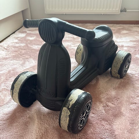 Plasto potkumopo. Vaaleanpunainen. Haalistunut hieman auringossa. Ehjä ja toimiva