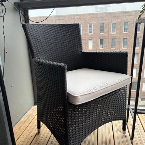 Polyrottinki terassituoli harmaa käsinojilla. Tuolissa on metallirunko ja punottu polyrottinkipinta istuimessa ja selkänojassa. Käsinojat ja korkea selkänoja tarjoavat perusmukavuutta. Soveltuu ulkokäyttöön esimerkiksi terassille, parvekkeelle tai puutarhaan. Tuolit on hyvässä kunnossa ja säilytetty talvet varastossa.