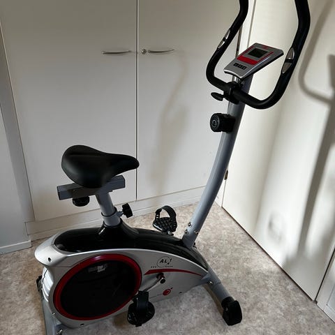 Valkoinen kuntopyörä kotikäyttöön. Laitteessa on säädettävä satula ja ohjaustanko sekä mekaaninen vastuksen säätö. Nouto.