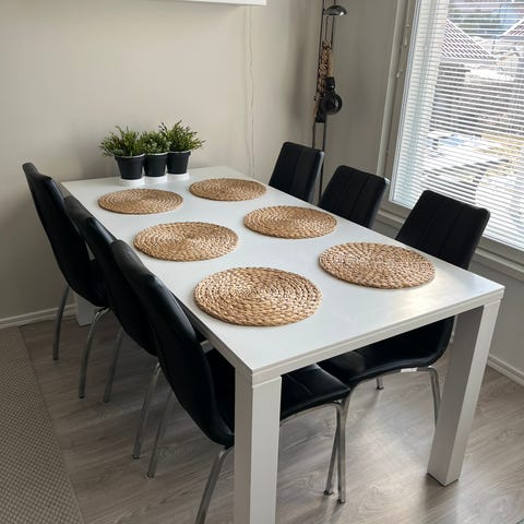 Puinen ruokapöytä ja tuolit setti vaalealla viimeistelyllä