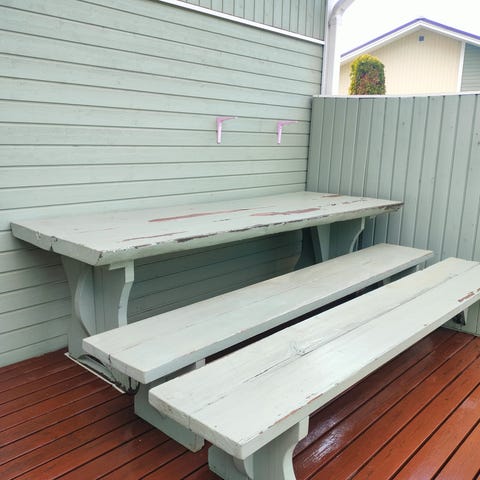 Kyllästetystä puusta valmistettu pihakeinu. Keinussa on kaksi vastakkain olevaa istuinta ja tukeva puinen runko..