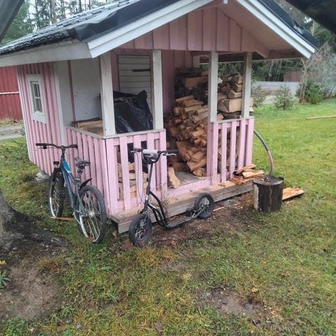 Puinen punainen pihamökki. Mökki soveltuu esimerkiksi vierasmajaksi, varastoksi tai oleskelutilaksi pihapiiriin. Koko n. 4,5x3,2 (sis. terassin n. 1,0)