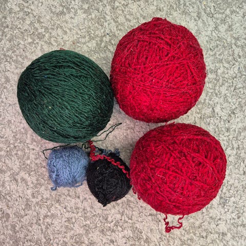 Erivärisiä ja paksuisia langanjämiä: villaa, akryyliä, puuvillaa, mukana voi myös olla sekoitelankoja.