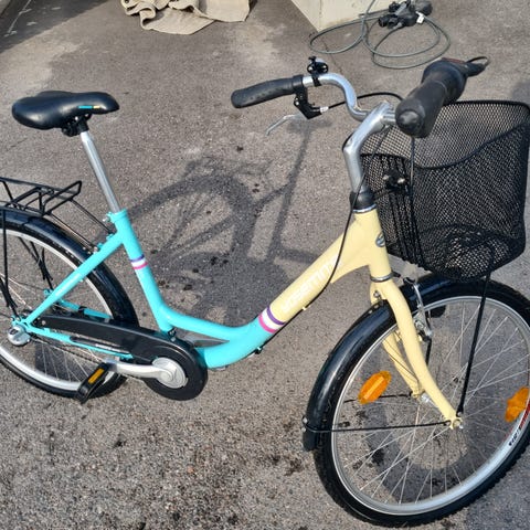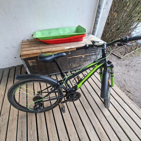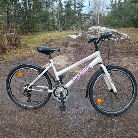 Lasten polkupyörä, jossa 24" renkaat. Rungon väri on musta ja keltainen, pyörässä on lukko. Hyvin vähällä käytöllä ollut, lähinnä koristeena sisällä varastossa.
