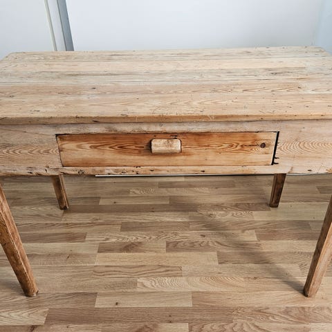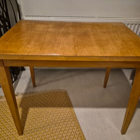 Myydään käytetty pöytä. Pöydässä on jonkin verran käytön jälkiä ja yksi pieni pintavirhe, kuten kuvista näkyy. Pöytä on kuitenkin edelleen tukeva ja täysin käyttökelpoinen.