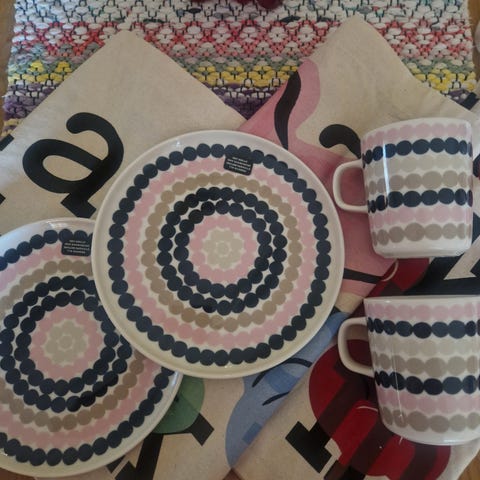Myynnissä käyttämättömät, vain vitriinissä koristeena olleet Marimekon vihreäraitaiset Siirtolapuutarha Räsymatto-mukit (2,5dl) 2 kpl yhteishintaan 42e. Nouto Askolasta tai postitus +8,90e. MMM. Katsothan muutkin ilmoitukseni :)