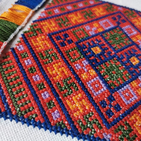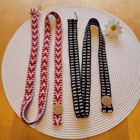 Punavalkoista käsinkudottua pirtanauhaa, metritavarana