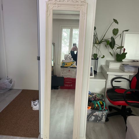 IKEA kokovartalopeili valkoisella rungolla. Peili on vapaasti seisova ja sen alla on ritilähylly.
