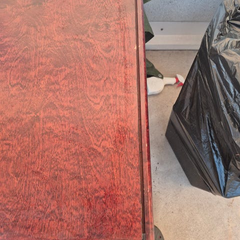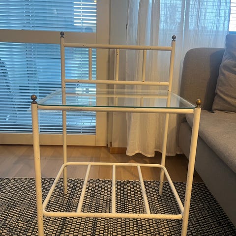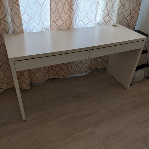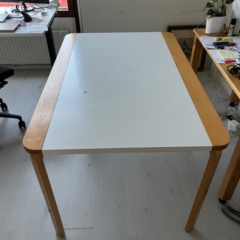 Annetaan valkoinen Ikean pöytä. Ollut parvekepöytänä mistä johtuen jaloissa ja pöytälevyssä kosteuden merkkejä ja jotkut reunat repsottaa. Ehjä muuten, itselläni ei enää käyttöä sille.