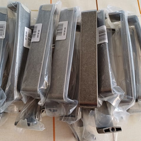 Keittiökaappien vetimet uusien tieltä myyntiin. 35kpl, reikien väli 96mm. Kiinnityspultteja löytyy mukaan yhteensä 22kpl. Soveltuvat esimerkiksi keittiökaappeihin, lipastoihin tai muihin kaapistoihin. Mitat näkyvät kuvissa mittanauhan kanssa, korkeus tasosta noin 2,5cm