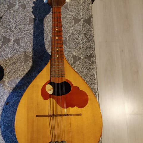 Hieno Pekka-Soittimen 12-kielinen mandoliini vuodelta 1950. Tarrat ja leimat kertovat lisää. Ehjä ei halkeamia.