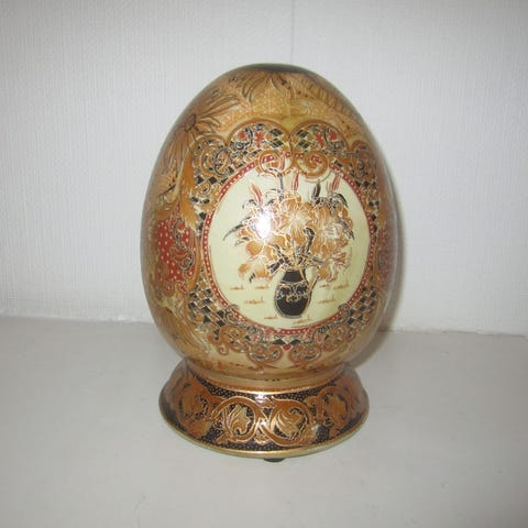 - puinen muna, johon on kaiverrettu koristeita., pituus n. 7 cm ja ympärysmitta n. 14 cm