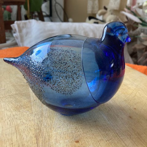 Sininen lasilintu koriste-esine. Valmistettu puhalletusta lasista, pinnassa tummansinisiä ja vaaleampia kirjavia sävyjä. Sopii sisustuselementiksi esimerkiksi hyllylle, ikkunalaudalle tai vitriiniin.